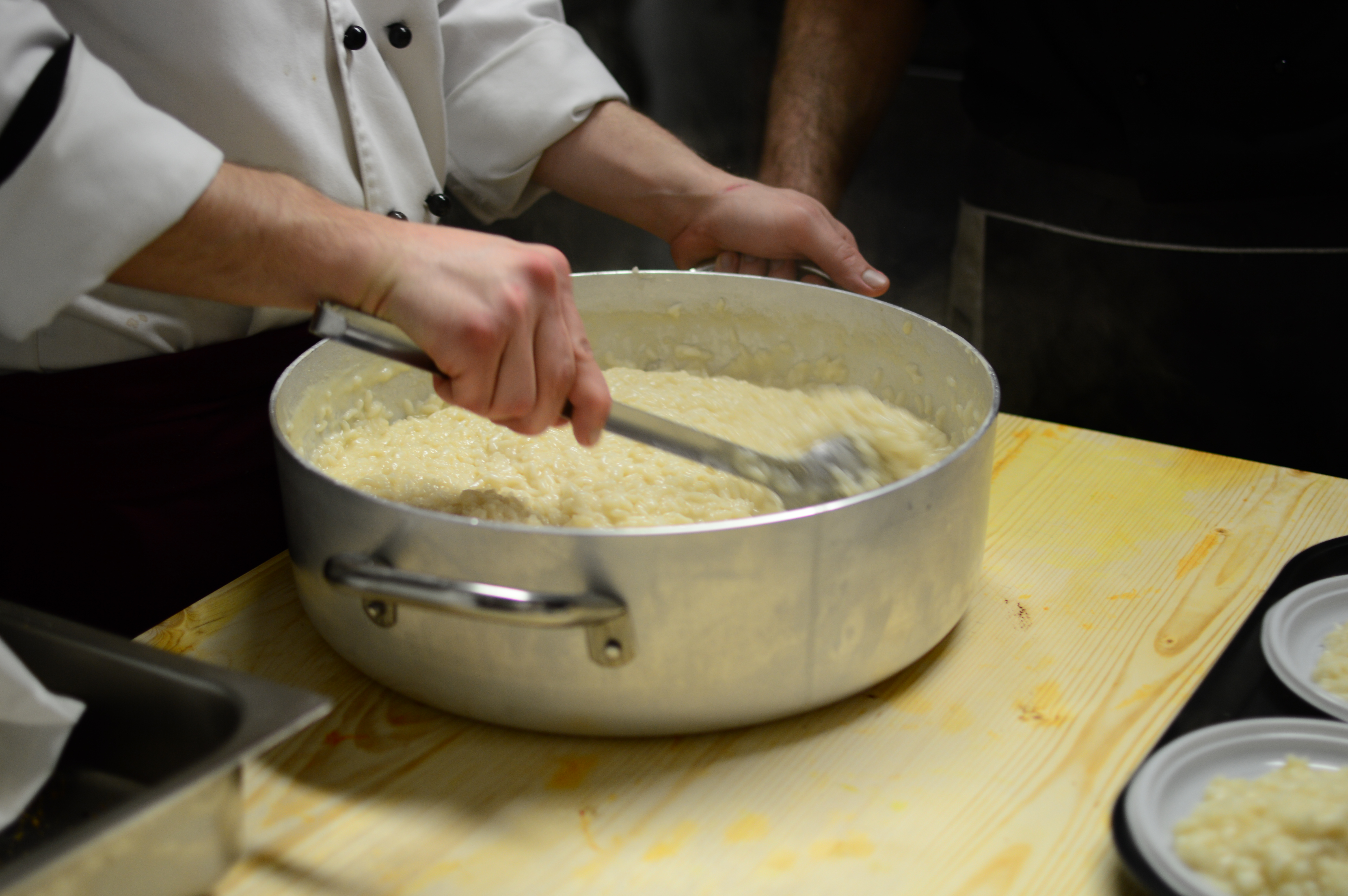 Sul fuoco a media intensità soffriggere la cipolla e, di conseguenza, tostare il riso. Appena inizia a “scricchiolare”, bagnarlo con Malvasia.